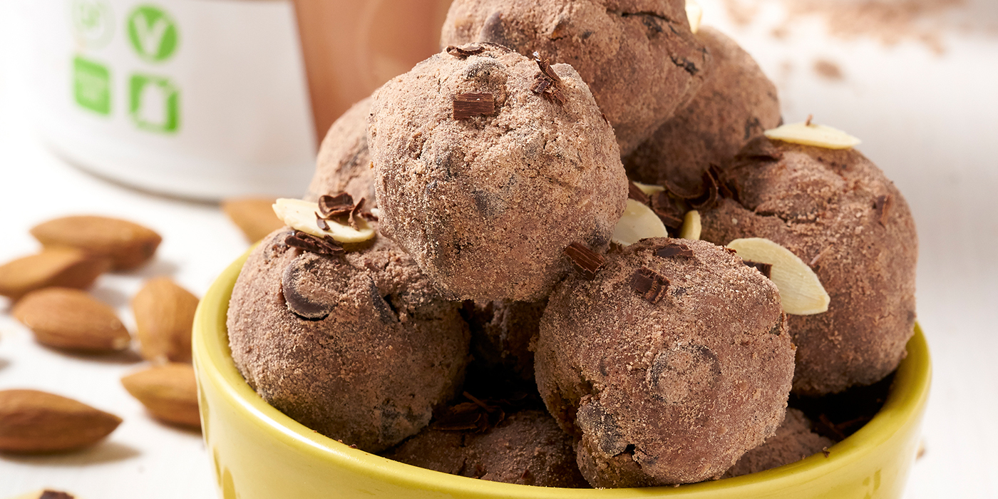 5. En un cuenco pequeño, mezcla el F1 Chocolate Cremoso con el cacao en polvo. Haz rodar las bolitas por esta mezcla hasta cubrirlas por completo.